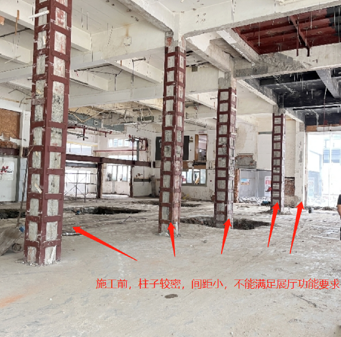 本項(xiàng)目位于上海市虹口區(qū)汶水東路957號(hào),建于 1998年,地上2層鋼筋混凝土框架結(jié)構(gòu),本建筑功能為汽車(chē)銷(xiāo)售展廳。1樓前廳部分混凝土柱拆除,形成大空間,拆除柱子位于兩個(gè)軸線上,數(shù)量共計(jì)10根。我司團(tuán)隊(duì)負(fù)責(zé)設(shè)計(jì)和施工。