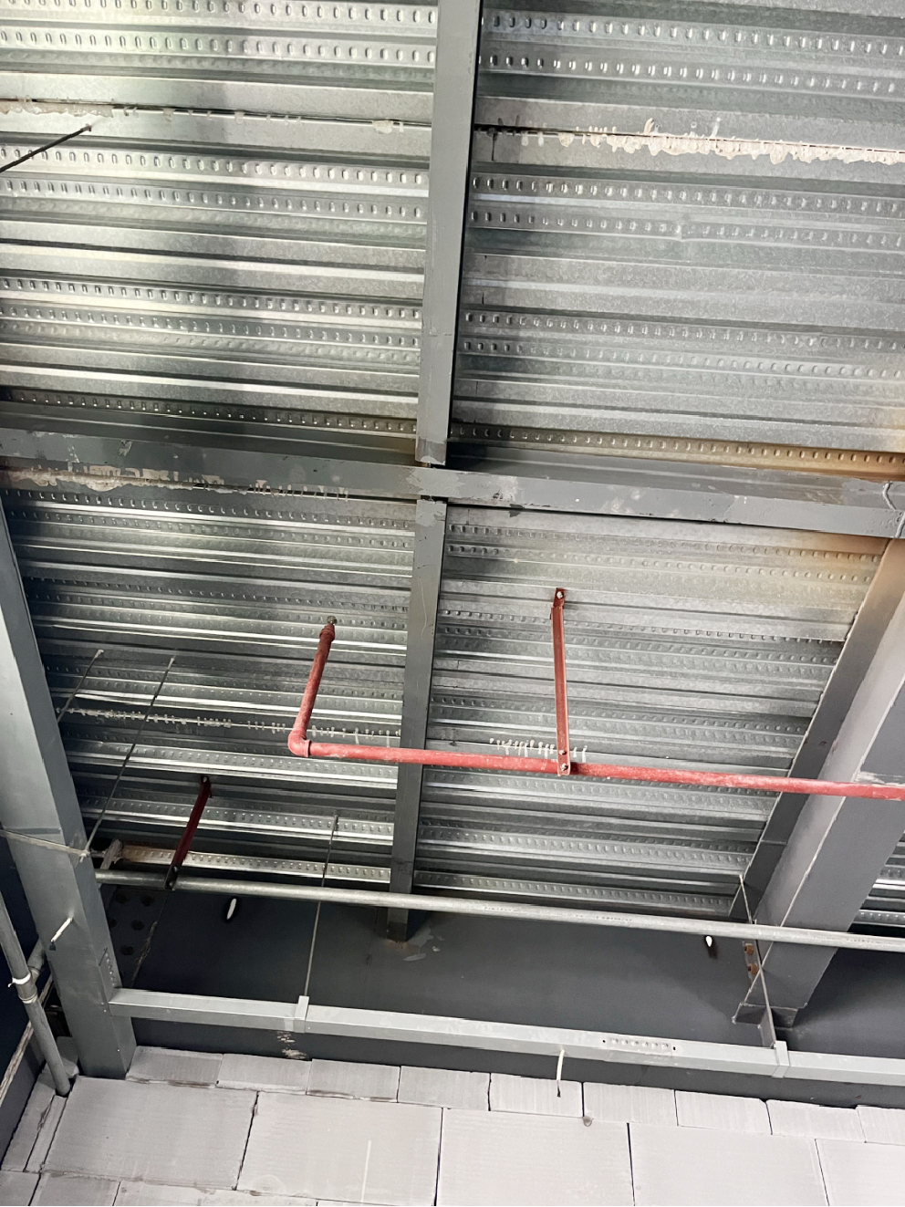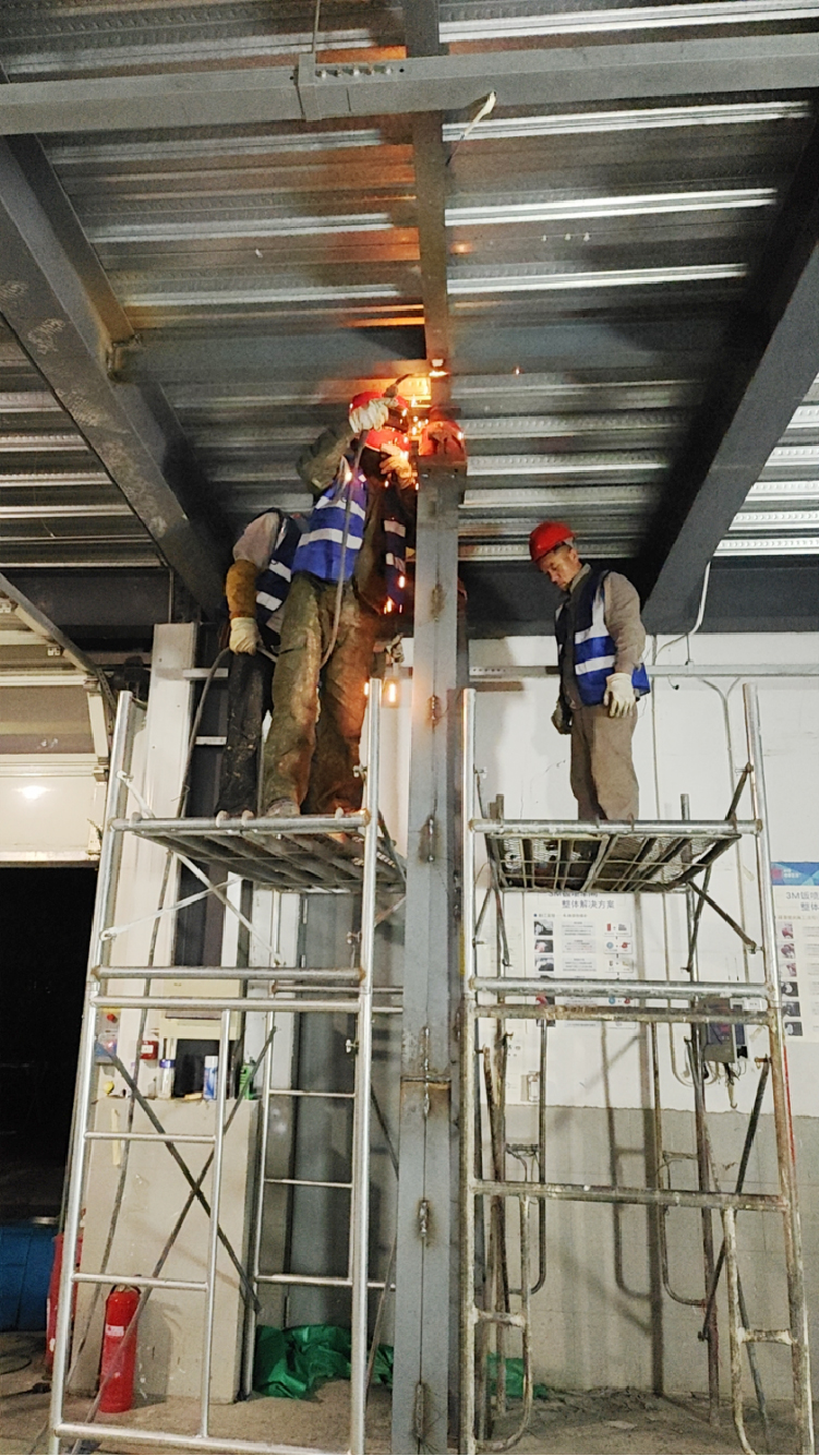 工程約建造于2013年前后,包含兩幢房屋,分別為主樓和輔樓。主樓為兩層鋼框架結構,現(xiàn)作為展廳、維修車間和辦公使用。輔樓為兩層鋼框架結構,一層作為維修車間,二層作為倉庫使用。該房屋擬在室內(nèi)區(qū)域加裝一部電梯,作為汽車升降之用,原主樓混凝土屋面作為停車場使用,輔樓二層改為汽車維修車間使用。